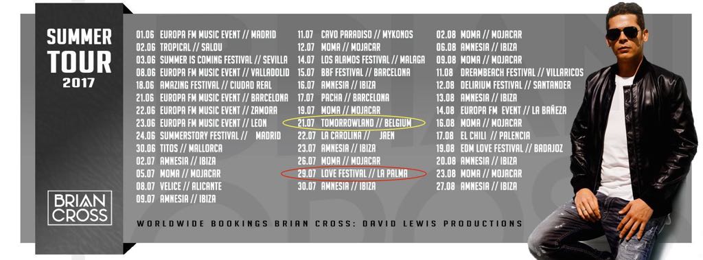BRIAN CROSS ha confirmado en su destacada agenda de conciertos prevista para este verano 2017 que el próximo 21 de julio actuará de nuevo, por tercer año consecutivo, en el mayor evento de Djs del mundo, el festival de música electrónica Tomorrowland Bélgica, justo unos días antes de volar a La Palma para cerrar el LOVE MUSIC FESTIVAL.