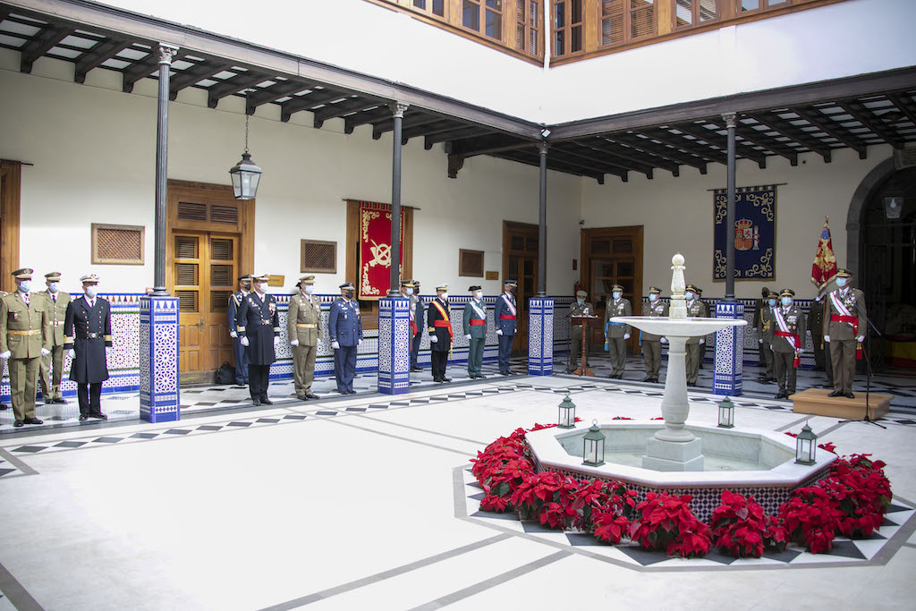 La celebración, muy condicionada por la actual situación provocada por el coronavirus, tuvo lugar igual que el año anterior en el patio central del Palacio de Capitanía General de Canarias, sede del Mando de Canarias