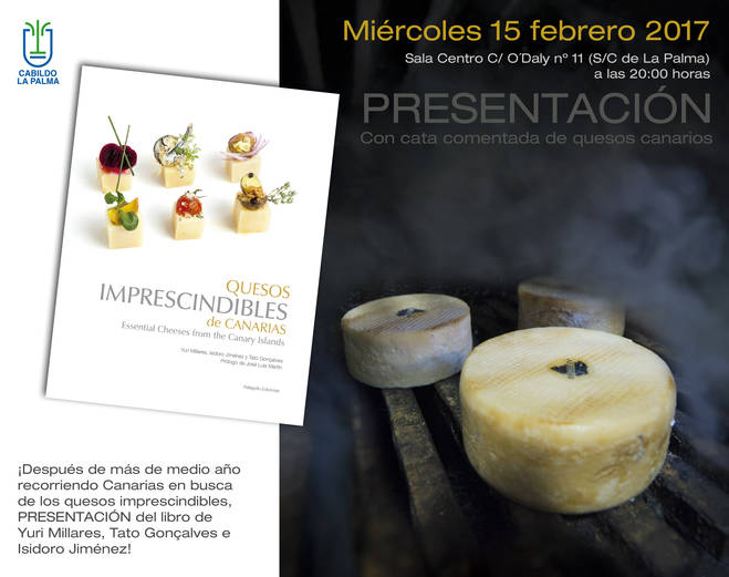La Consejería de Agricultura, Ganadería y Pesca del Cabildo de La Palma, organiza este miércoles, 15 de febrero, la presentación del libro Quesos imprescindibles de Canarias, de los autores Yuri Millares, Isidoro Jiménez y Tato Gonçalves. La cita será en la Sala Centro de Santa Cruz de La Palma, a partir de las 20:00 horas.