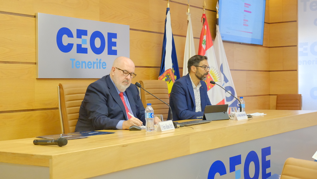El presidente de esta Confederación de Empresarios, D. Pedro Alfonso Martín, junto al director de consultoría D. José Miguel González Hernández, han presentado el Informe de Coyuntura de Canarias para el tercer trimestre de 2022.