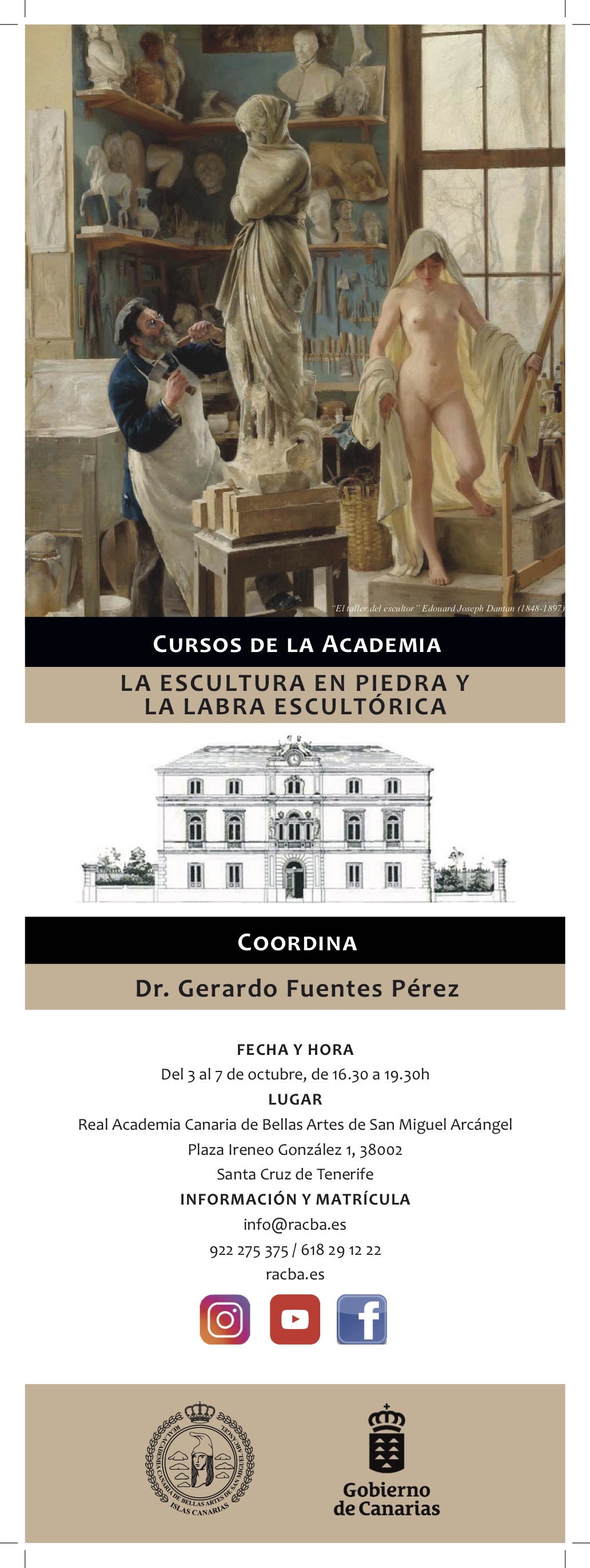 La Real Academia Canaria de Bellas Artes de San Miguel Arcángel (Racba) lleva a cabo el curso Escultura en piedra y labra escultórica, que tendrá lugar del 3 al 7 de octubre, y está coordinado por el vicepresidente de la corporación, Gerardo Fuentes Pérez.