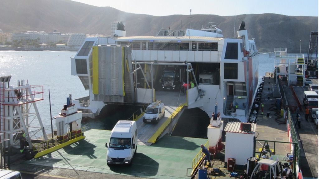 Naviera Armas Trasmediterránea ha puesto en funcionamiento esta misma mañana la nueva rampa de tierra en la que opera en el puerto de Los Cristianos, sur de Tenerife, con los puertos de San Sebastián de La Gomera, Santa Cruz de La Palma y La Estaca (El Hierro). La nueva rampa soporta un peso máximo de 64 toneladas y su correspondiente equipamiento y de su realización y montaje se ha ocupado la empresa tinerfeña S Montajes S.L.