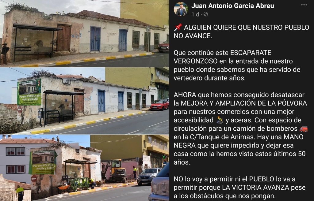Hay informes técnicos, lo ha sacado la prensa ya, recomendando la protección de esas casas que prácticamente es lo que queda en la carretera general porque hay alguna más que también tienen pensado tumbar para rotondas y demás, ese es el panorama y eso está más que visto, pero el espectáculo de este viernes a la carrera sin proyecto de demolición ni nada que se le parezca ¡hasta los trabajadores municipales sin un triste casco! da que pensar. Su reacción, desde la visceralidad y sin respeto alguno por el que opina distinto y que siempre es un enemigo externo al que hay que declararle la guerra, pues dice mas bien poco de su capacidad de encajar las críticas. ¿Que se cree que desde aquí sacamos este tema como ocurrencia nuestra o porque nos llega por parte de esa minoría de vecinos suyos que no lo ven? En fin, a mi sí que me había llamado la atención la pancarta de la indignidad esa que puso a modo de propaganda, que no hablaba de demolición pero provocaba una mala impresión terrible tristemente confirmada.