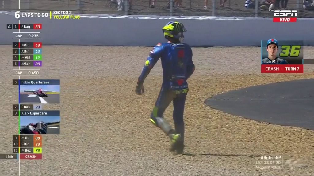 Joan Mir fue la primera baja en ese grupo al sufrir una caída en la curva siete, instantes después de que les superase a él y a Aleix Espargaró, el italiano "La Bestia" Bastianini.