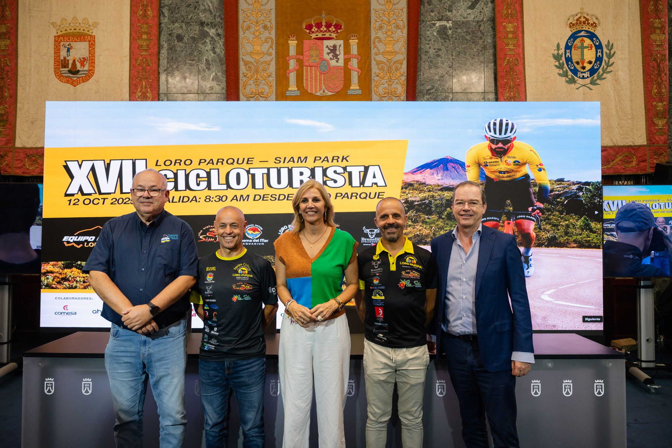El domingo, 12 de octubre, se celebrará la XVII Cicloturista Loro Parque Siam Park, uniendo el norte y el sur de Tenerife a través del desarrollo de una prueba no competitiva, donde los ciclistas participantes podrán celebrar una jornada de puro ciclismo, además de disfrutar del Loro Parque y del Siam Park, desarrollando una actividad respetuosa con el medio ambiente, y que tienen una gran acogida entre los aficionados al pedal, donde todos los años ha tenido una numerosa participación. La prueba se presentó oficialmente hoy en el Salón Noble del Cabildo de Tenerife, con la presencia de la consejera de Deportes del Cabildo de Tenerife, Yolanda Moliné, acompañada por el vicepresidente del Grupo Loro Parque, Christoph Kiessling; el presidente del Club Ciclista Loro Parque Los Silos Natural, Adriano Cordovés; y el secretario de la Federación Canaria de Ciclismo, Agustín Rodríguez.