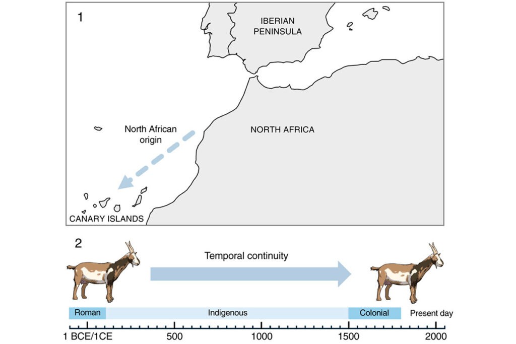 Investigaciones arqueológicas, lingüísticas y paleogenómicas han revelado que las poblaciones humanas de Canarias tienen su origen en el norte de África. Un nuevo estudio internacional, liderado por universidades canarias, ha puesto de manifiesto que las cabras que habitan actualmente en el archipiélago son descendientes directos de los animales traídos por los primeros colonizadores.