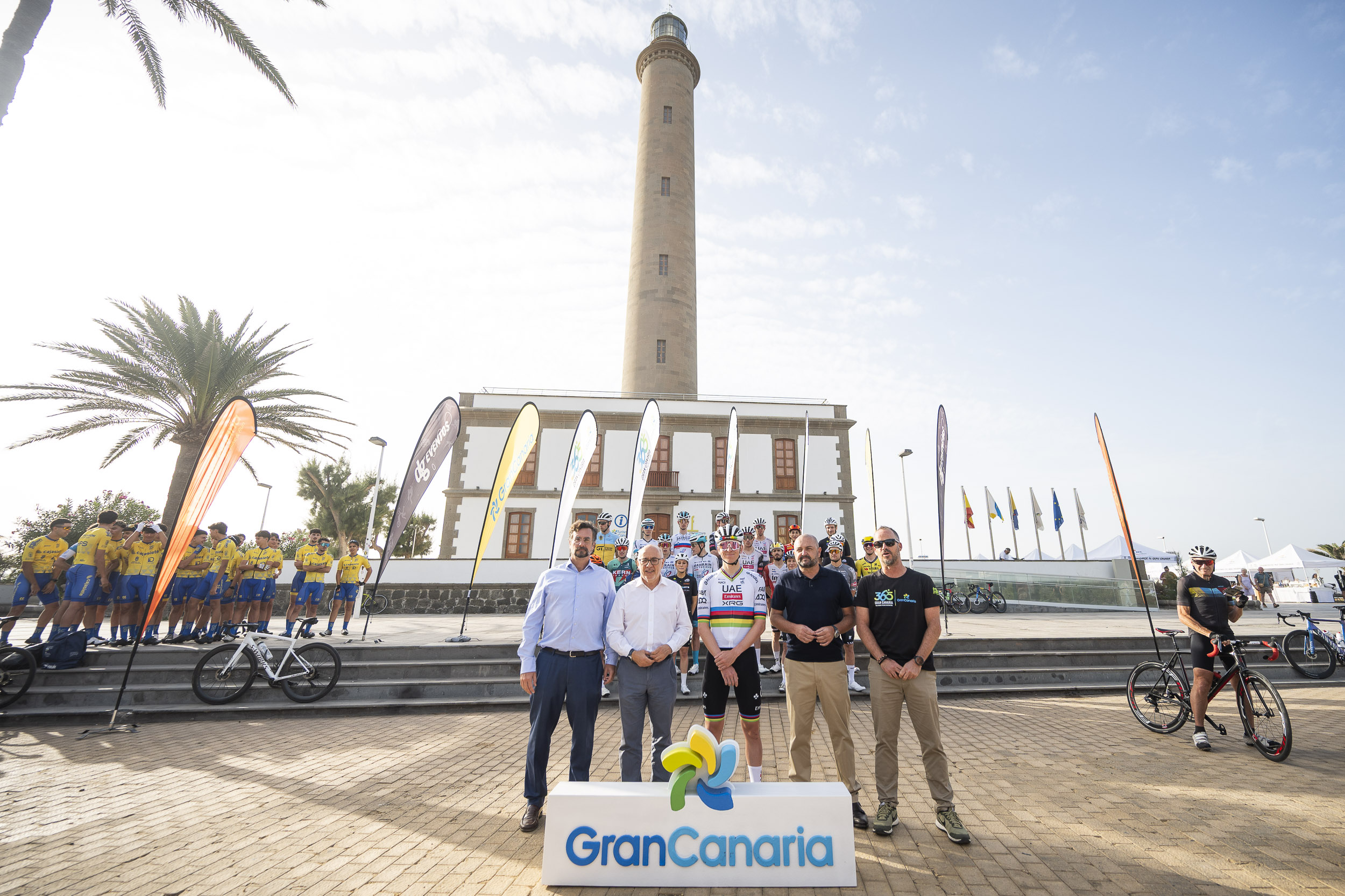 Una veintena de ciclistas del pelotón internacional, liderado por el campeón del mundo, Tadej Pogačar, junto a representantes institucionales y promotores del proyecto, escenificaron el pistoletazo de salida de esta iniciativa, en un acto en el que el presidente del Cabildo de Gran Canaria, Antonio Morales, y el consejero insular de Turismo, dieron la bienvenida a los deportistas que estarán rodando por la isla durante los próximos días.