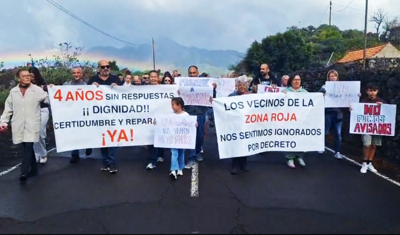 En la concentración, con el Tajogaite como telón de fondo, se dio lectura a un manifiesto en el que los afectados de la denominada "zona roja" —la que en el mapa de la planificación provisional vigente aparece sometida a un régimen de protección cautelar— aseguran sentirse “ultrajados, engañados y agraviados” en comparación con otros damnificados que han percibido indemnizaciones públicas por el valor de lo perdido y además conservan sus terrenos con la esperanza de poder volver a recuperar el uso que tenían antes de la erupción.