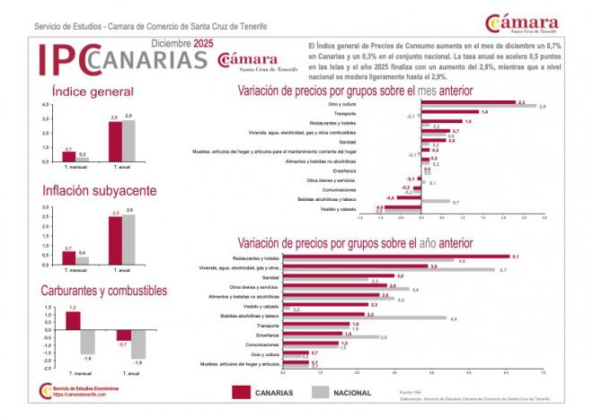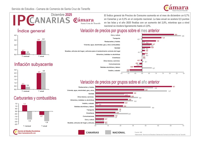 También se produce un incremento en la tasa interanual, tras cerrar el ejercicio con una inflación del 2,8%, un nivel muy próximo al registrado en el conjunto de España, donde la tasa se situó en el 2,9% y el mayor valor desde julio del año 2024.