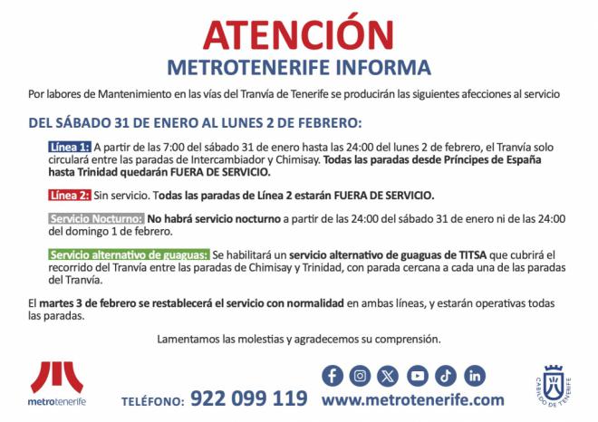 Metrotenerife informa de que entre el sábado 31 de enero y el lunes 2 de febrero se llevarán a cabo labores de mantenimiento en la plataforma tranviaria que obligarán a alterar la operativa de la red. Durante esos días, los tranvías solo circularán en la Línea 1 entre las paradas de Intercambiador y Chimisay, habilitándose un servicio alternativo de guaguas entre las paradas de Chimisay y La Trinidad. Por su parte, la Línea 2 así como el servicio nocturno de la Línea 1 no estarán operativos.