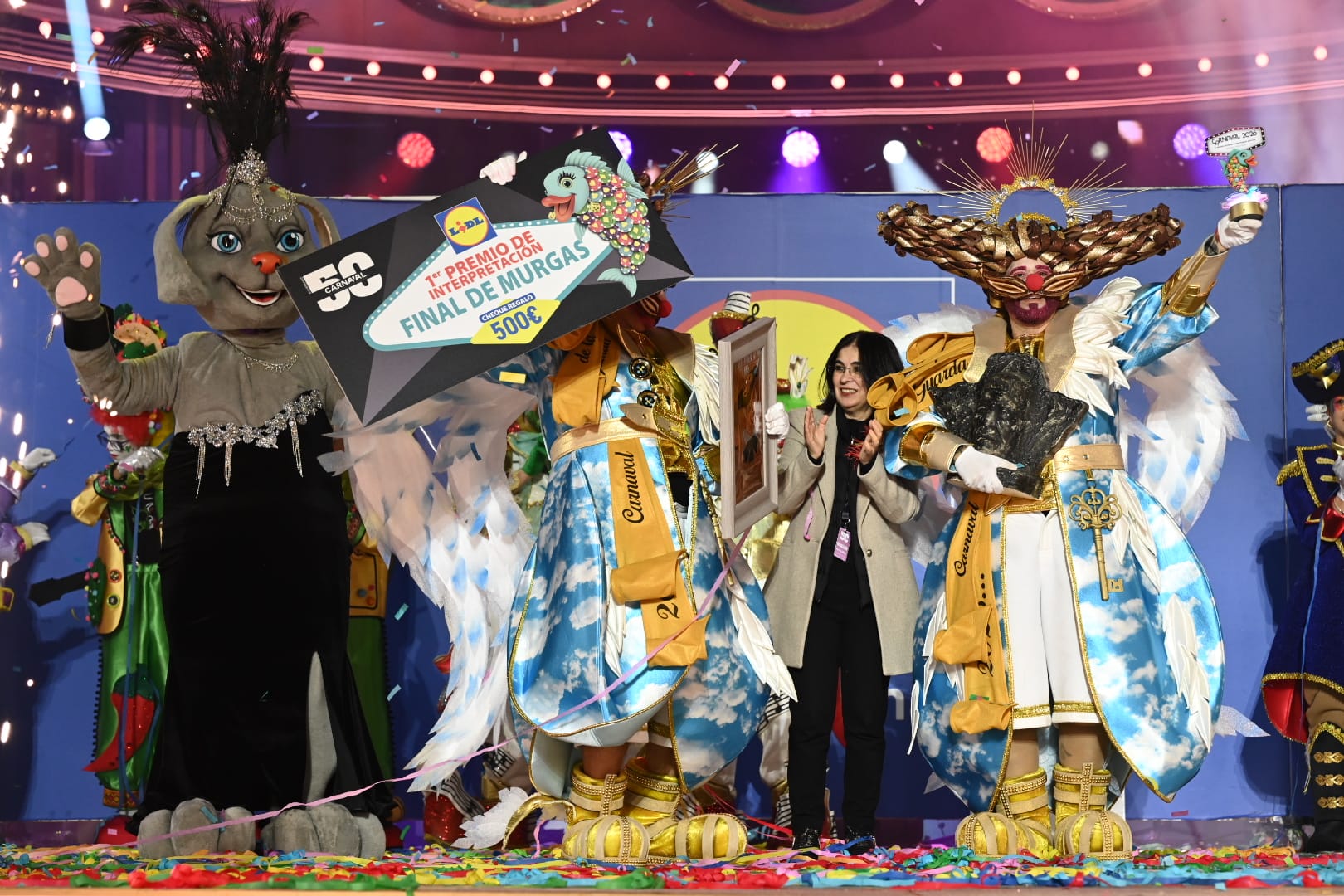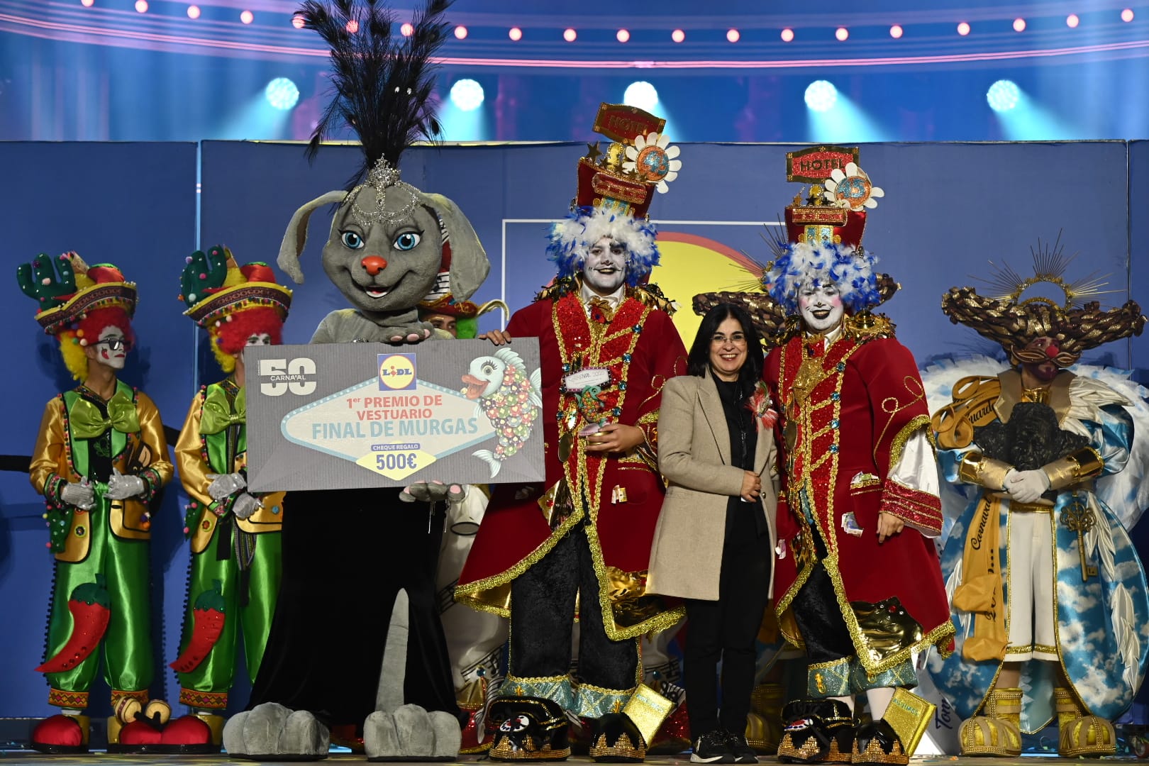 La alcaldesa Carolina Darias y el concejal Héctor Alemán fueron los encargados de poner en manos de los grupos los trofeos y distinciones que certificaban su lugar en un palmarés que también fue contemplado por la marca patrocinadora del concurso. LIDL, presente en fases y final del 2 al 7 de febrero, obsequió con un interesante regalo a las murgas que lograron situarse en lo alto del podio en interpretación y vestuario: Los Legañosos y Los Serenquenquenes, respectivamente. Cada uno recogió un cheque regalo valorado en 500 euros para invertir en sus establecimientos