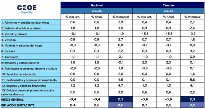 En la provincia de Santa Cruz de Tenerife, la inflación interanual se situó en el 2,0% en enero, por debajo del dato regional de Canarias (2,3%), reflejando una evolución de los precios más contenida en el ámbito provincial. En términos mensuales, los precios registraron un descenso del -0,7%, en línea con la corrección observada en el conjunto del Archipiélago al inicio del año.