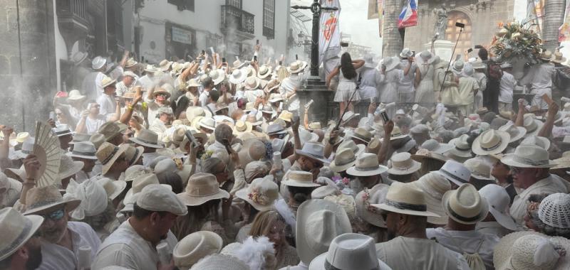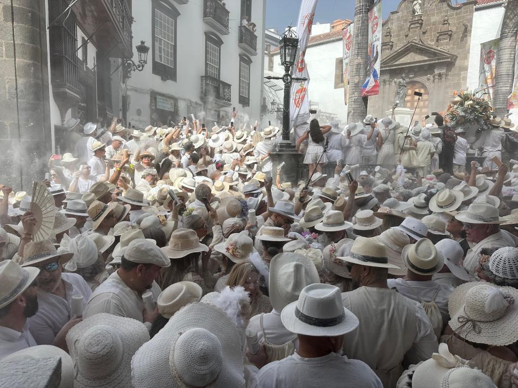 Desde primeras horas de la mañana, más de 70.000 Indianas e Indianos comenzaron a recorrer las calles de la capital palmera ataviados con trajes blancos, guayaberas, vestidos de lino, encajes, sombreros y maletas, mientras una intensa nube de talco envolvía plazas y avenidas al ritmo de habaneras, congas y sones cubanos.