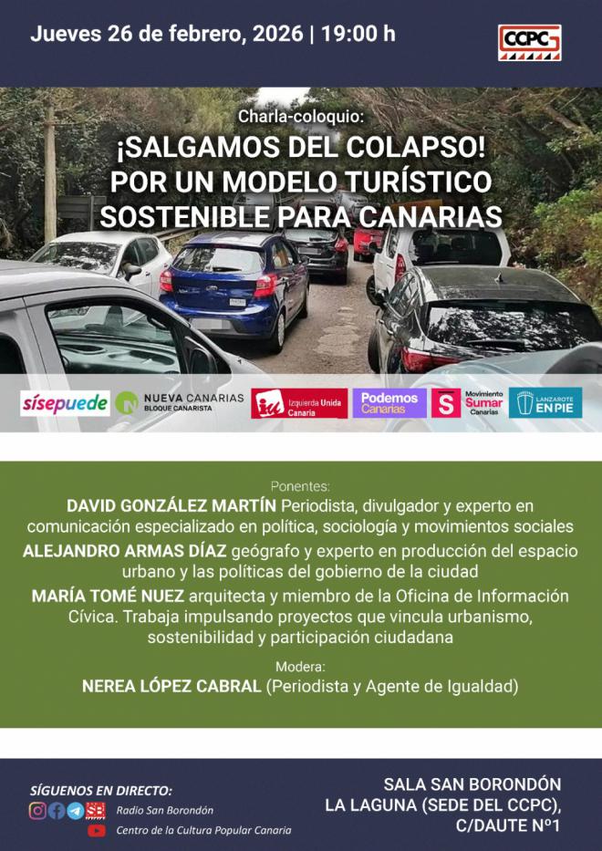 Las formaciones políticas Sí se Puede, Nueva Canarias - Bloque Canarista (NC-BC), Izquierda Unida Canaria (IUC), Podemos Canarias, Movimiento Sumar Canarias y Lanzarote en Pie organizan el próximo jueves 26 de febrero, a las 19:00 horas, la charla-coloquio “¡Salgamos del colapso! Por un modelo turístico sostenible para Canarias”, que se celebrará en el Centro de la Cultura Popular Canaria, en la Sala San Borondón, en La Laguna.
