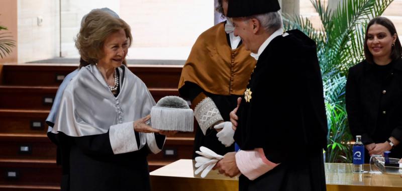 La Universidad de Las Palmas de Gran Canaria inviste como Doctora Honoris Causa a SM. La Reina Doña Sofía, en reconocimiento a su implicación en iniciativas sociales y humanitarias, y especialmente por su apoyo incondicional al Banco de Alimentos. Asimismo, el Rector destacó en su discurso el firme compromiso de Doña Sofía con la cultura, la ciencia y la educación. “Es usted una figura institucional de primer orden, con un mérito intelectual, ético y social acorde con los valores que definen a la universidad contemporánea”, señaló. “Porque una universidad no solo produce conocimiento, también lo orienta, lo cuestiona y lo pone al servicio de la sociedad”, indicó al aforo. “Y en ese empeño por facilitar el desarrollo del saber, del pensamiento crítico y de la responsabilidad cívica, la trayectoria de quien fue nuestra Reina constituye un referente indiscutible”.