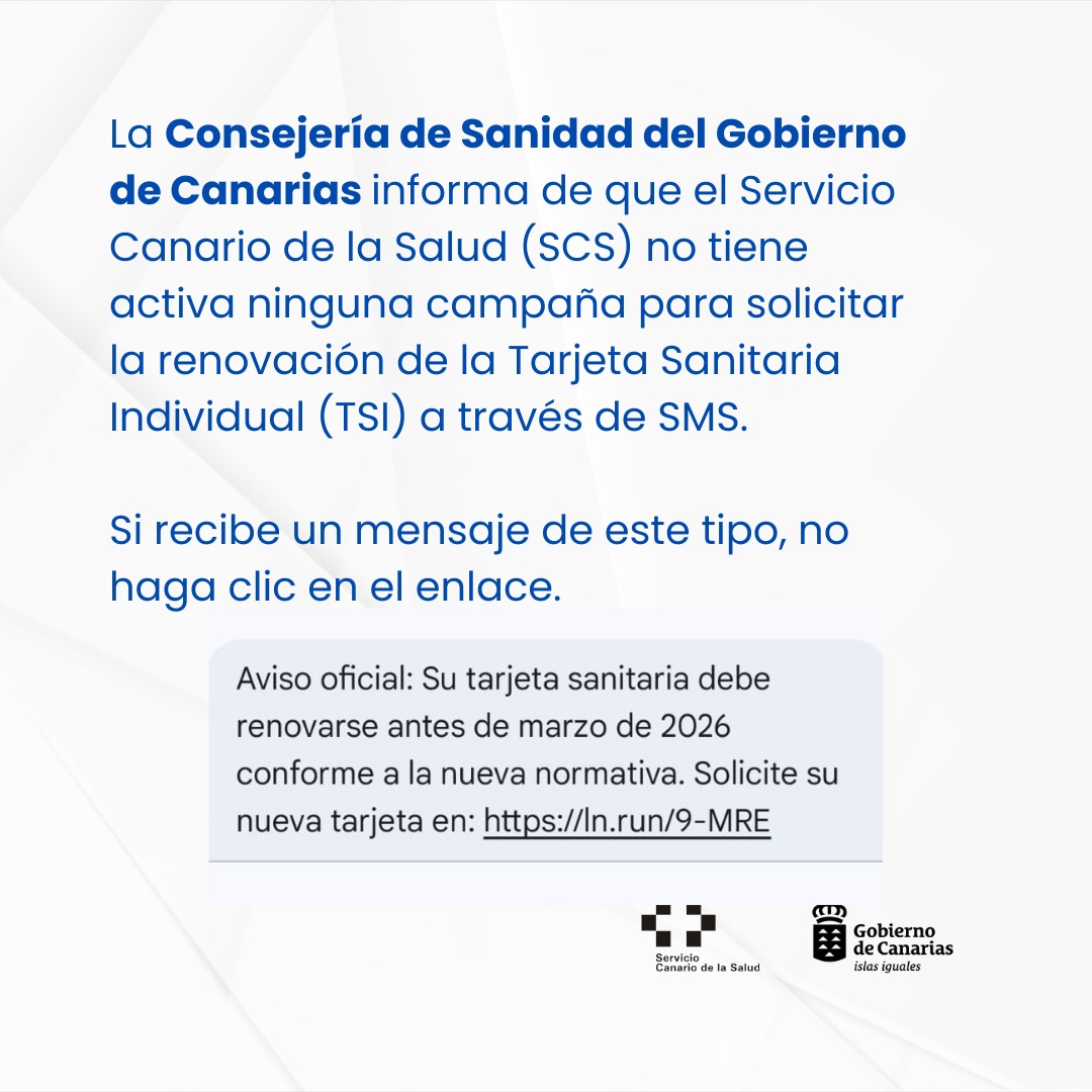 La Consejería de Sanidad recuerda a la ciudadanía que el Servicio Canario de la Salud no solicita la renovación ni la actualización de la Tarjeta Sanitaria Individual mediante SMS ni a través de enlaces acortados, y que nunca se pedirán datos bancarios para este trámite, por lo que ruega no responder a estos mensajes.