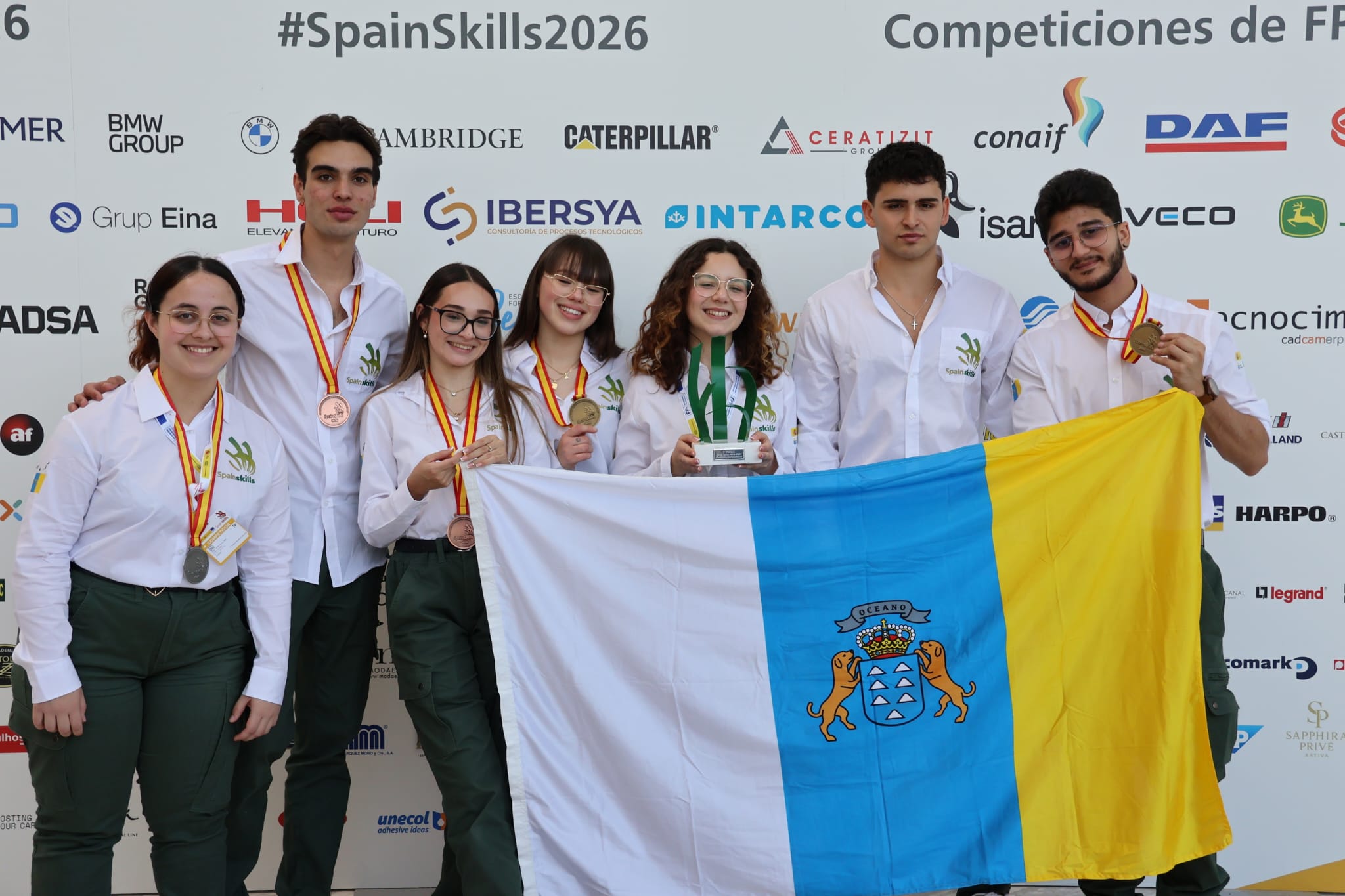 La delegación canaria que ha participado en el campeonato nacional SpainSkills 2026, celebrado esta semana en Madrid y organizado por el Ministerio de Educación, Formación Profesional y Deportes, ha firmado un resultado histórico al lograr, en modalidad de competición, dos medallas de oro, una de plata y dos de bronce, a las que se suman, en modalidad de exhibición, una plata y un bronce más. Especialmente relevante es el doble oro ya que, por primera vez, dos estudiantes del archipiélago representarán a España en el campeonato mundial WorldSkills Shanghai 2026, que se celebrará en China en septiembre, un hito sin precedentes para la FP canaria.