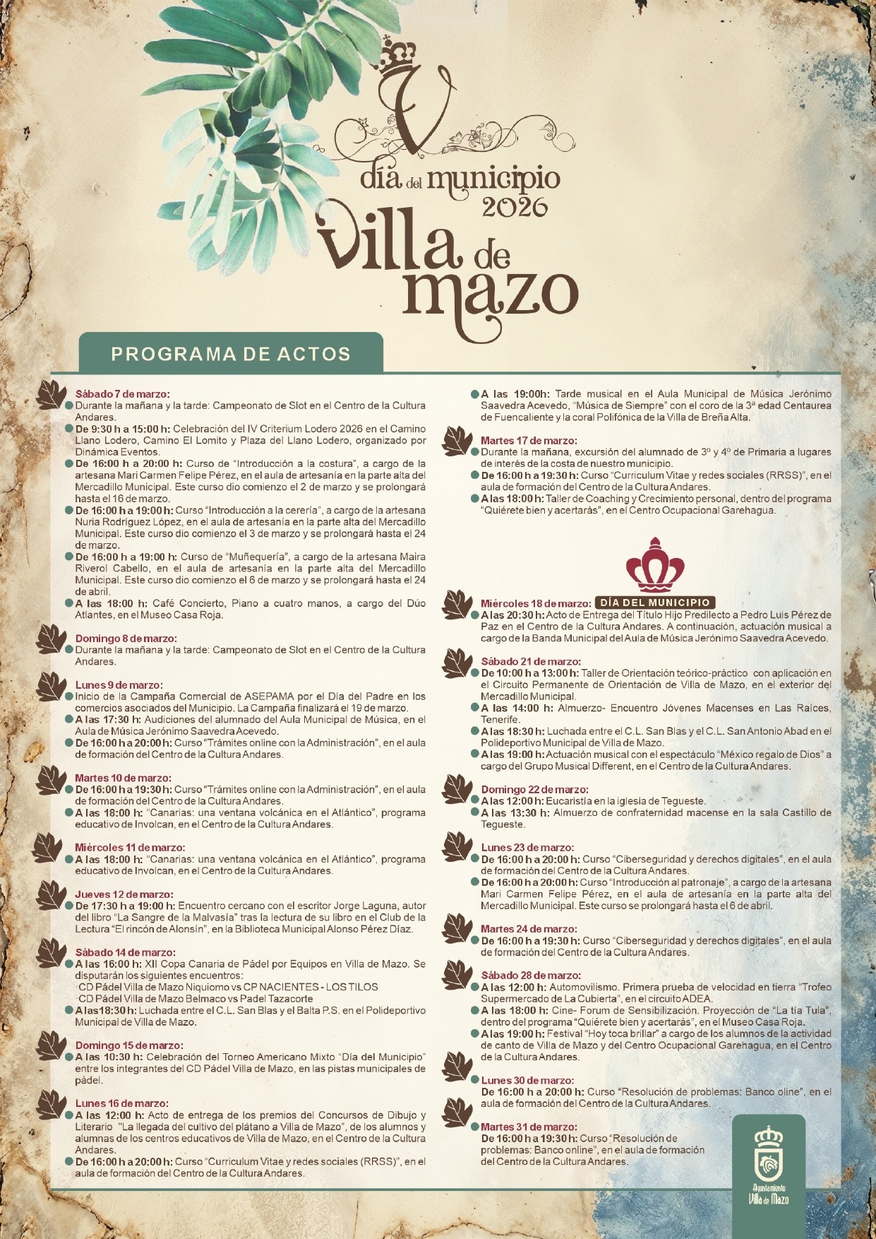 El Ayuntamiento de Villa de Mazo celebra el Día del Municipio con una agenda que se desarrollará a lo largo de todo el mes de marzo con actividades culturales, deportivas y sociales. Entre otros actos destacados se encuentra la entrega del título de Hijo Predilecto a Pedro Luis Pérez de Paz el próximo miércoles, 18 de marzo.