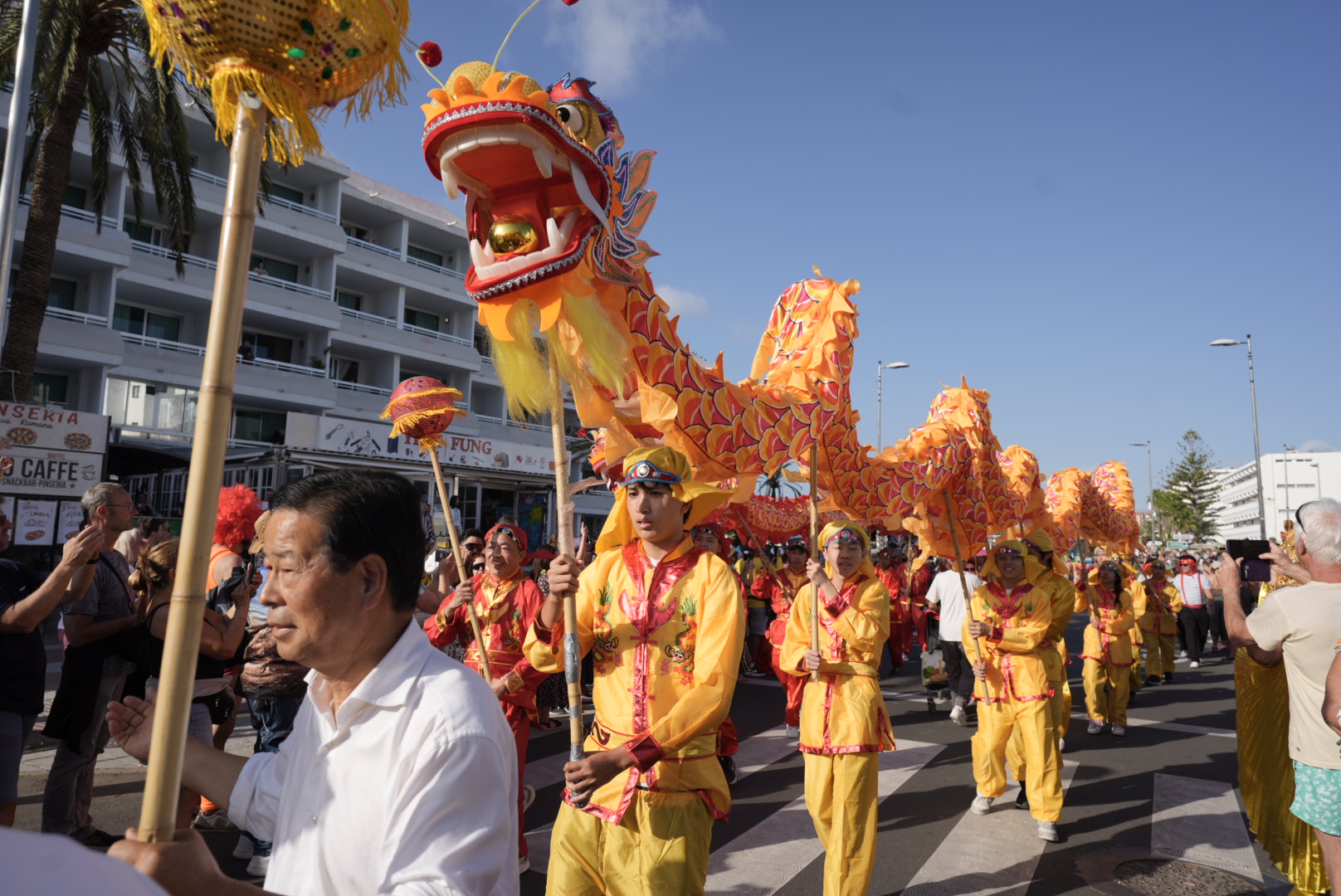 El desfile contó con una apertura de lujo encabezada por grupos ya emblemáticos del carnaval como la Comparsa Cumbacheros, la Batucada Aborigen, la murga Las Crazy Trotas, la Comparsa Cayo Mambí y la Batucada Piratas del Caribe. Tras ellos, el brillo de la corte real deslumbró al público, destacando la presencia de la Reina del Carnaval, Estrella Jiménez, la Gran Dama, Inmaculada Ojeda y Drag Ávalon, acompañadas de sus respectivas damas de honor y finalistas de la Gala Drag. Mención especial merece la Asociación China de las Islas Canarias, que aportó una nota exótica y espectacular con sus tradicionales dragones, causando una gran impresión entre los asistentes en esta, su primera participación en el evento.