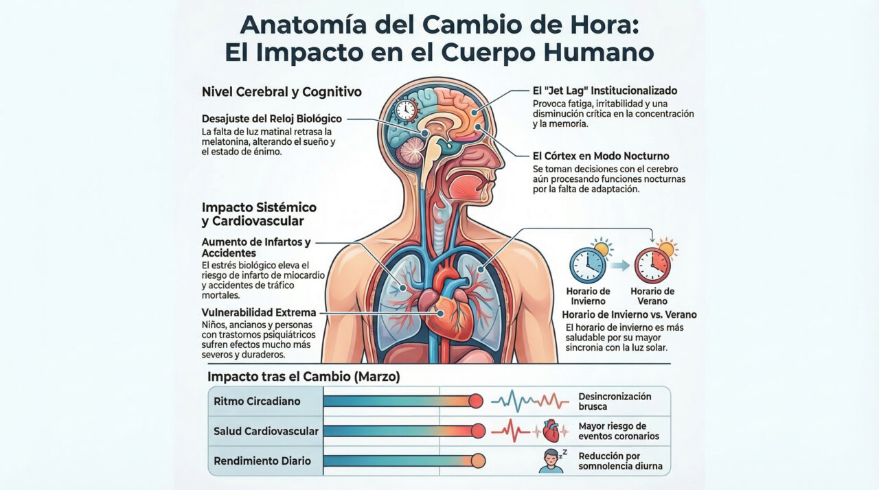 La infografía ilustra cómo el cambio de hora afecta la salud cardiovascular y cognitiva.