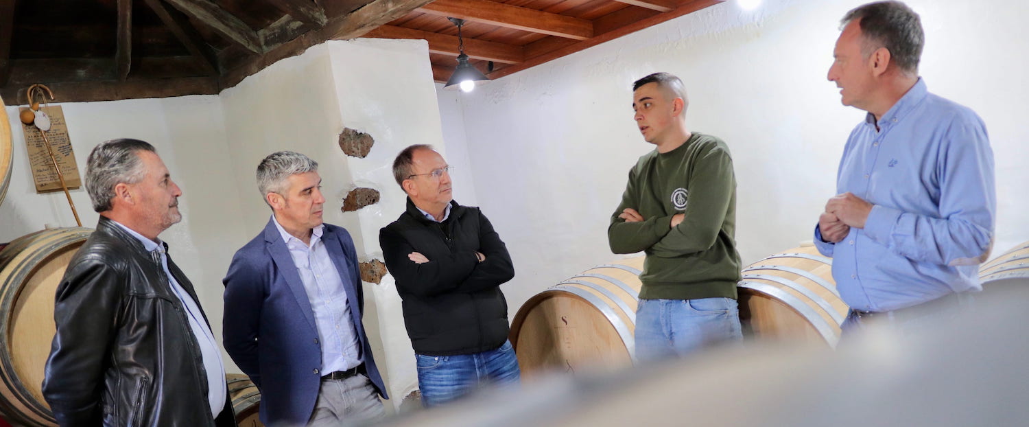 El consejero de Agricultura, Ganadería, Pesca y Soberanía Alimentaria, Narvay Quintero, y el presidente del Cabildo de La Palma, Sergio Rodríguez, junto al consejero del mismo área de la corporación insular, Alberto Paz, y el alcalde de Puntagorda, Vicente Rodríguez Lorenzo, visitaron la semana pasada la bodega de Michael Candelario Candelario en La Palma. Bautizado en redes sociales y en los medios de comunicación como “La joven promesa del vino”, este vitivinicultor, de 25 años, produce unos 10.000 kilos de uva anualmente y ya comercializa sus elaboraciones en países como Estados Unidos, Suecia, Alemania e Italia.