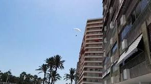 Un parapente, paracaídas sin motor, invadió el cielo de la playa con movimientos norte sur y a la inversa, circulando cerca de los edificios Arensol y Euromar, y en un giro bruco se dirigió hacia el agua, en un momento en el que la playa estaba abarrotada. El aparato se dirigió hacia donde se encuentra la pista de petanca que hay en el paseo marítimo acercándose a la zona de arena donde el intrépido y, al parecer, experimentado piloto aterrizó en una zona de arena situada entre dos pasarelas de madera de las que dan acceso a la playa.