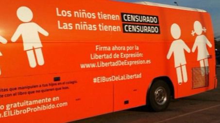El colectivo Hazte Oír ha presentado este martes el nuevo autobús que cambia su polémico lema sobre la transexualidad y que pasa a ser "los niños tienen 'censurado', las niñas tienen 'censurado'", con el que pretenden convertir su campaña en una defensa de la "libertad de expresión".