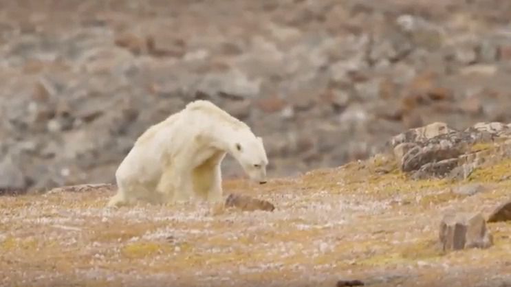 A lo lejos se ve cómo, con paso lento y cansado, un oso polar al que se le marcan los huesos avanza con dificultad. Cuando ha dado tan solo unos pasos, una de sus patas traseras le falla y cae casi completamente al suelo. A duras penas consigue levantarse y, moribundo, sigue su búsqueda de algo de comida.