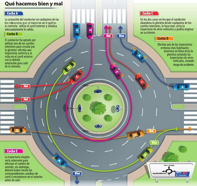 ceder el paso a quienes están dentro de ella y escoger el carril que considere más adecuado en función de la salida que vaya a tomar; una vez dentro, tiene preferencia el vehículo que está ocupando un carril respecto al que va a acceder a él; y, para salir de la glorieta, es imprescindible situarse previamente en el carril exterior; y si no ha sido posible, efectuar un nuevo giro para colocarse con tiempo en esa posición.