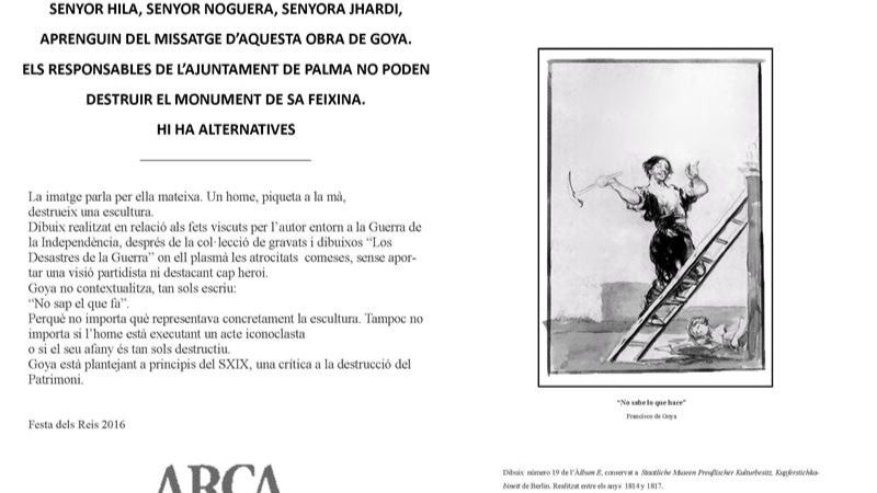 La intención de ARCA es que el alcalde "capte el mensaje que ya hace doscientos años dibujó este artista universal". Así, consideran, que "si en la época de Goya y durante una guerra, él ya consideró intolerable la destrucción del patrimonio, ahora, cuando no hay ninguna alteración del orden ni ilegalidad, es más imperdonable la destrucción de un monumento que forma parte de la historia personal y colectiva de Palma".