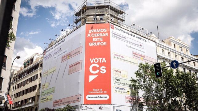Ciudadanos ha colocado en Madrid una nueva lona de propaganda electoral en la que promete "cerrar el grupo de WhatsApp del presidente del Gobierno y candidato del PSOE a la Moncloa, Pedro Sánchez, con "sus socios" de Podemos, ERC, PDeCAT y EH Bildu, que identifica como "el chat del Consejo de Ministros".