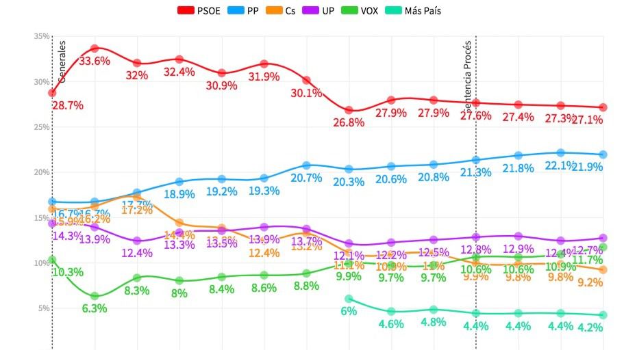 En cuanto a la evolución del voto, en la última oleada solo han subido Vox y Unidas Podemos, mientras que PP, PSOE y Más País sufren pequeñas variaciones.