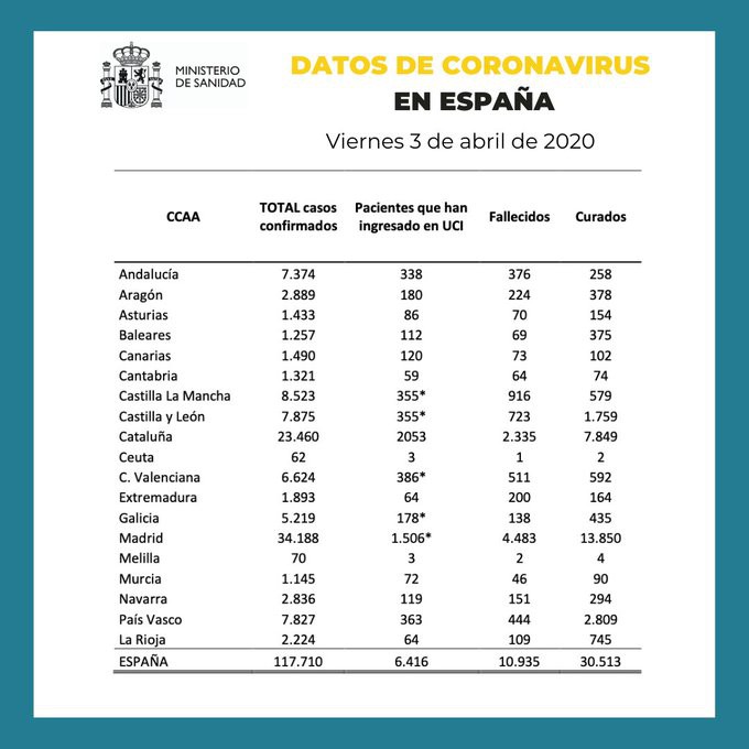 Las cifras del coronavirus en España: Este viernes se superan los 117.710 contagios y se llega a 10.935 fallecidos con 6.416 personas en la UCI y 30.513 curados.