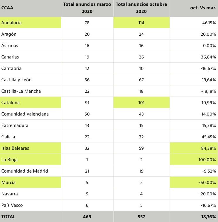 Aunque de media en España el número de activos hoteleros puestos a la venta se ha incrementado en torno al 19 %, en La Rioja, por ejemplo, el número se ha duplicado, en Baleares el aumento alcanza el 84 %, en Andalucía y Galicia supera el 45 %, en Canarias se acerca al 37 % y en Aragón y Castilla y León es del 20 %.