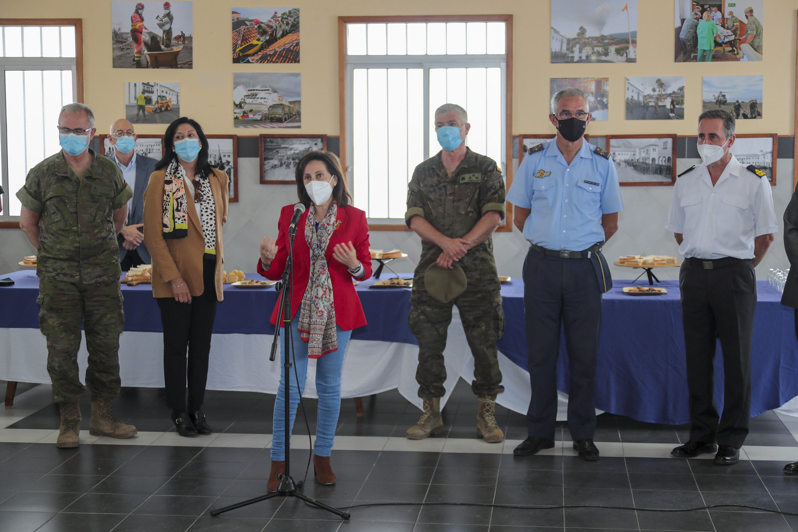 La ministra fue recibida en el acuartelamiento por el jefe del Mando de Canarias (MCANA), teniente general del Ejército de Tierra Alejandro Gonzalo Escámez, y por el jefe del acuartelamiento, el capitán del Ejército de Tierra Óscar Arranz. Posteriormente ha acudido a un acto en el que se han expuesto las actividades que se realizaron en el plan de emergencia de La Palma.