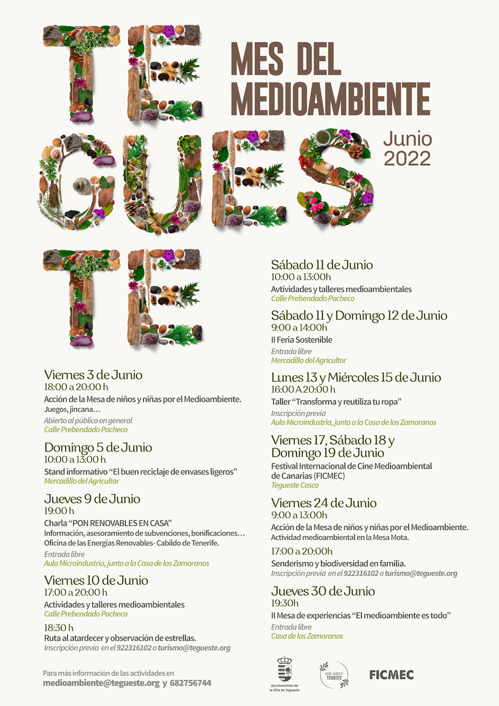 La Concejalía de Medioambiente y Transición Ecológica del Ayuntamiento de la Villa de Tegueste, organiza un amplio programa de actividades para celebrar el ‘Mes del Medioambiente’, que tendrán lugar entre el 3 y el 30 de junio. Entre las actividades previstas para este mes, Tegueste se convertirá en una de las sedes del Festival Internacional de Cine Medioambiental de Canarias (FICMEC), además de talleres, II Feria Sostenible, charlas y senderismo.