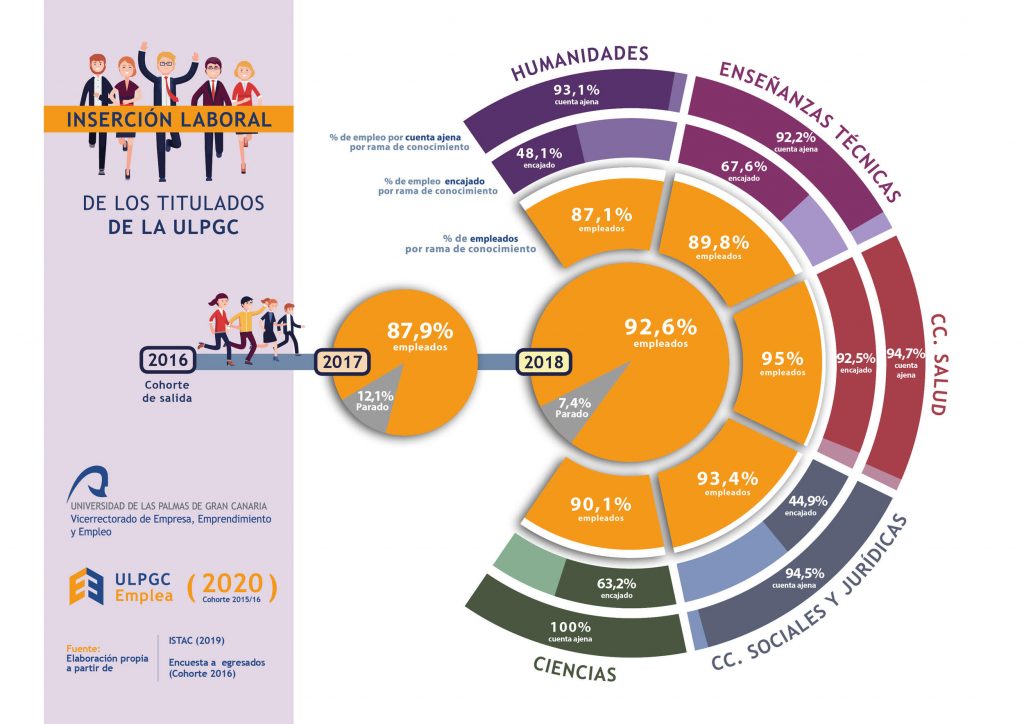 Un 92,6% de los estudiantes titulados en la ULPGC en 2016 se encontraba empleado a los dos años de finalizar sus estudios (2018), de acuerdo con los datos suministrados por el Vicerrectorado de Empresa, Emprendimiento y Empleo, que dirige la Vicerrectora Rosa Batista, que ha comunicado que ya están disponibles, en el Área de Publicaciones delObservatorio de Empleabilidad y Empleo de la ULPGC, los datos de inserción laboral de las diferentes titulaciones del Espacio Europeo de Educación Superior que se imparten en la ULPGC. En ese curso, titularon en la ULPGC un total de 2.846 estudiantes.